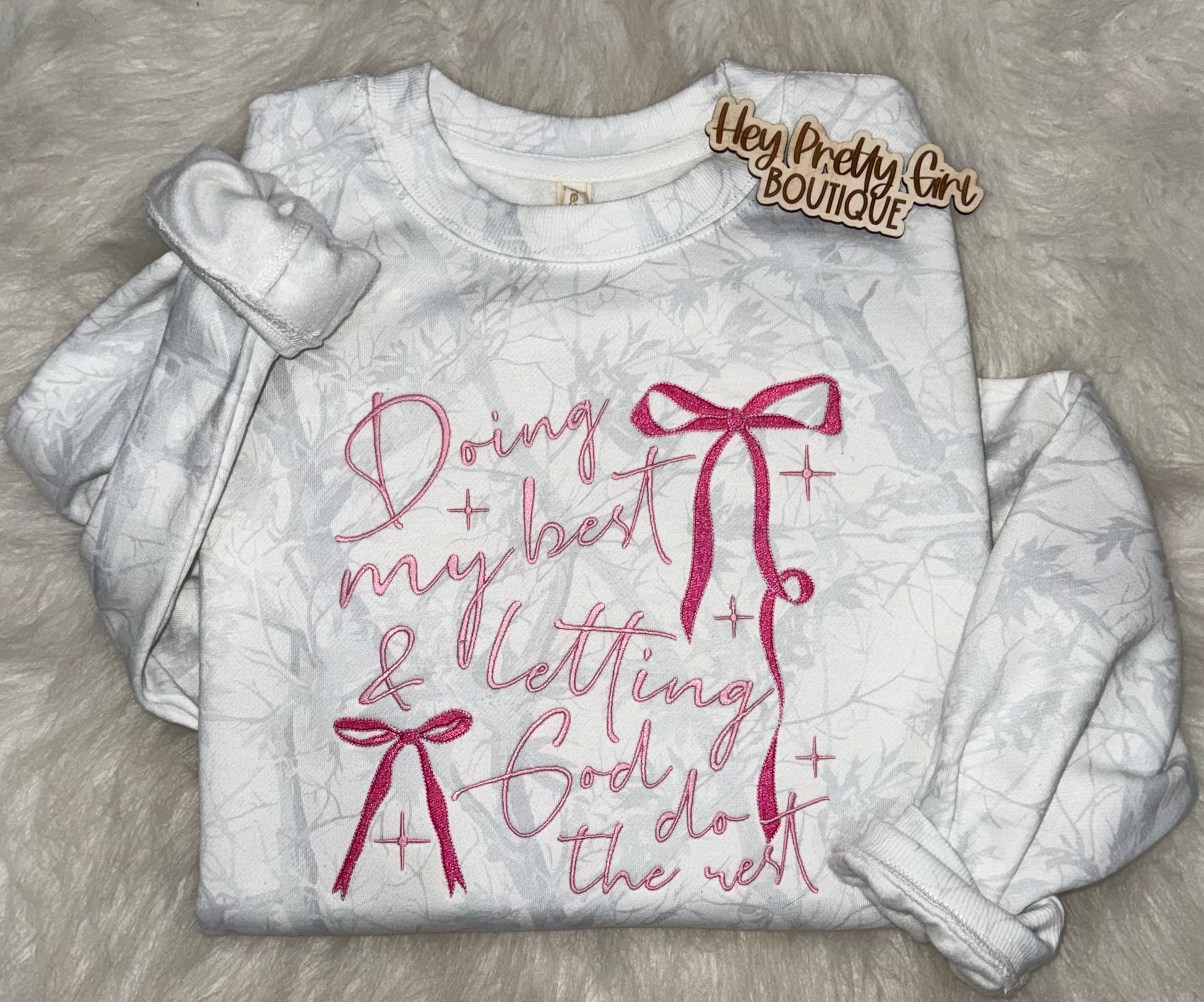 The Doing my best camo crew is more than just a cozy sweatshirt. With its true to size fit and ultra-soft fabric, it's the perfect addition to your wardrobe. And with its beautiful pink embroidery and positive message, it's sure to make a statement while spreading good vibes!