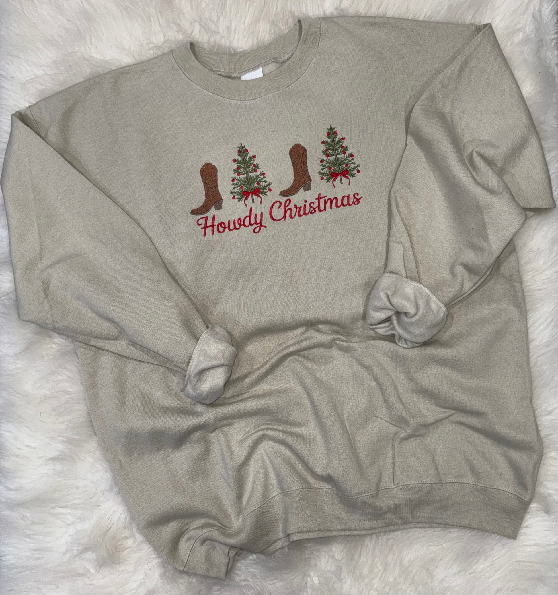"Spread some holiday cheer with our Howdy Christmas Western Embroidered Sweatshirt. In a stylish tan color, this unisex sweatshirt features vintage embroidered Christmas trees for a unique touch. The perfect fit for anyone, this sweatshirt is sure to bring a smile to your face. Yee-haw!"