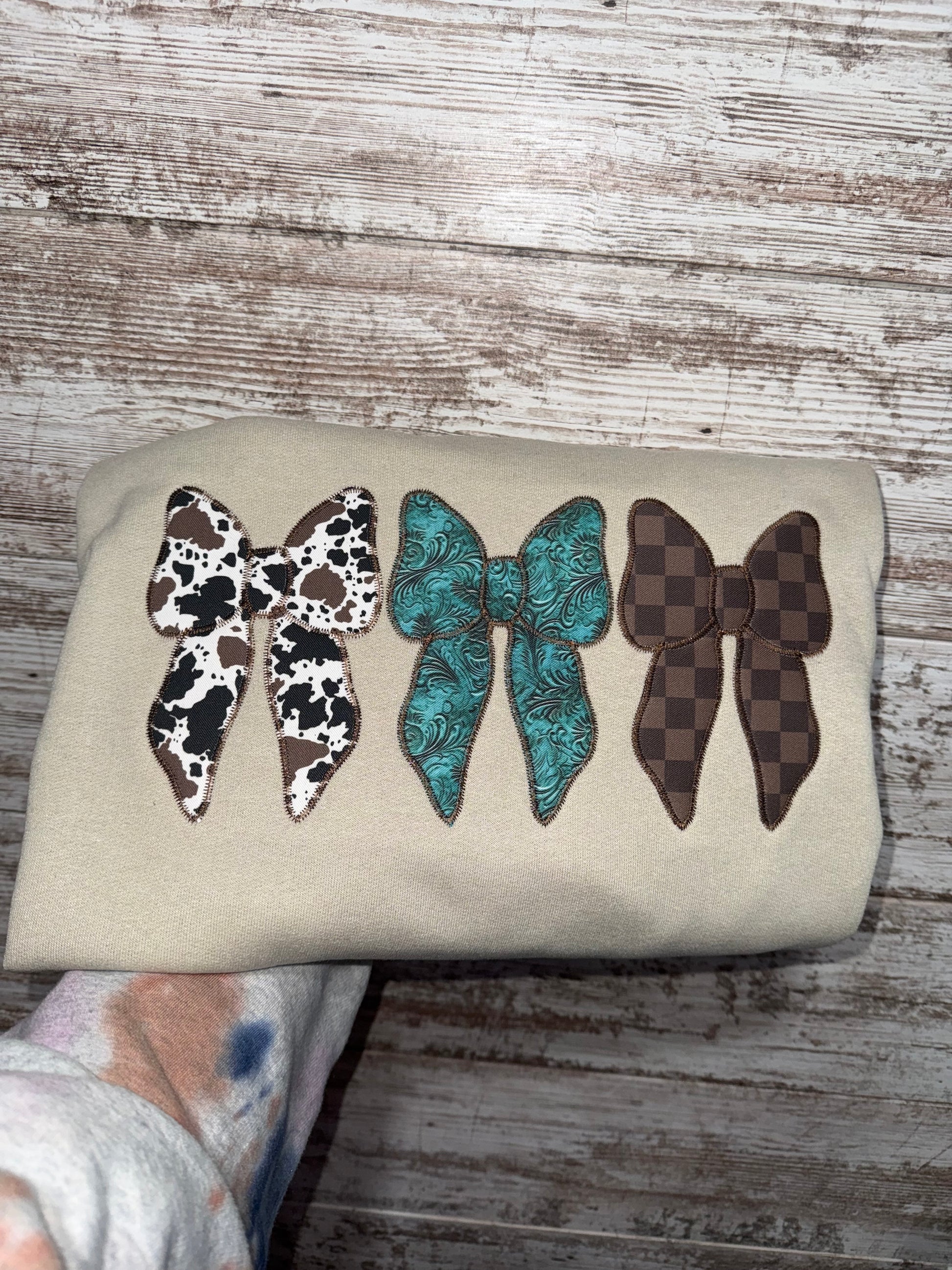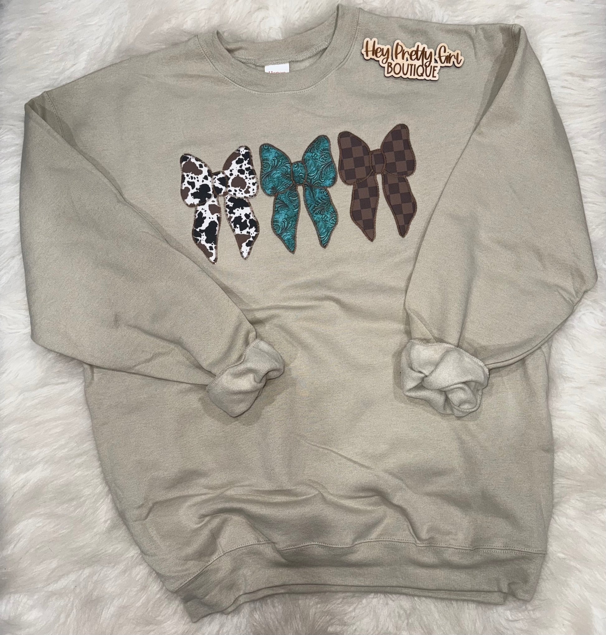 Hanes brand, slightly oversized, lightweight and soft, tan colored, appliquéd bows with western fabric